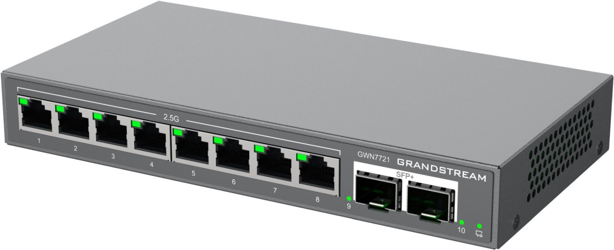 The GWN7721 and GWN7721P are 10-port Layer 2 Lite Managed Switches equipped with 8 2.5-Gigabit Ethernet ports and 2 10-Gigabit SFP+ ports to allow small-to-medium businesses to build scalable and secure high-speed networks.