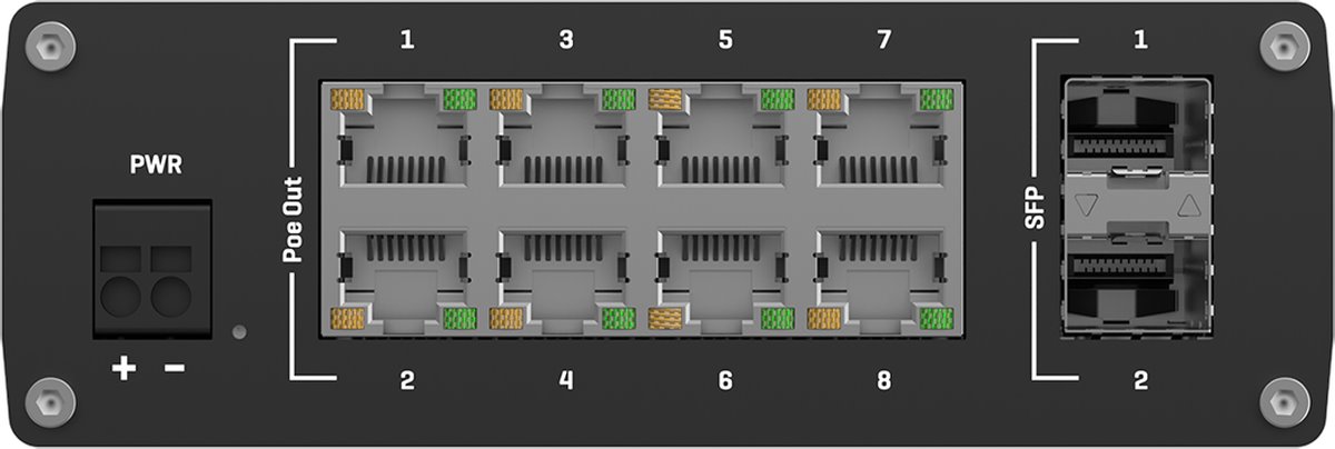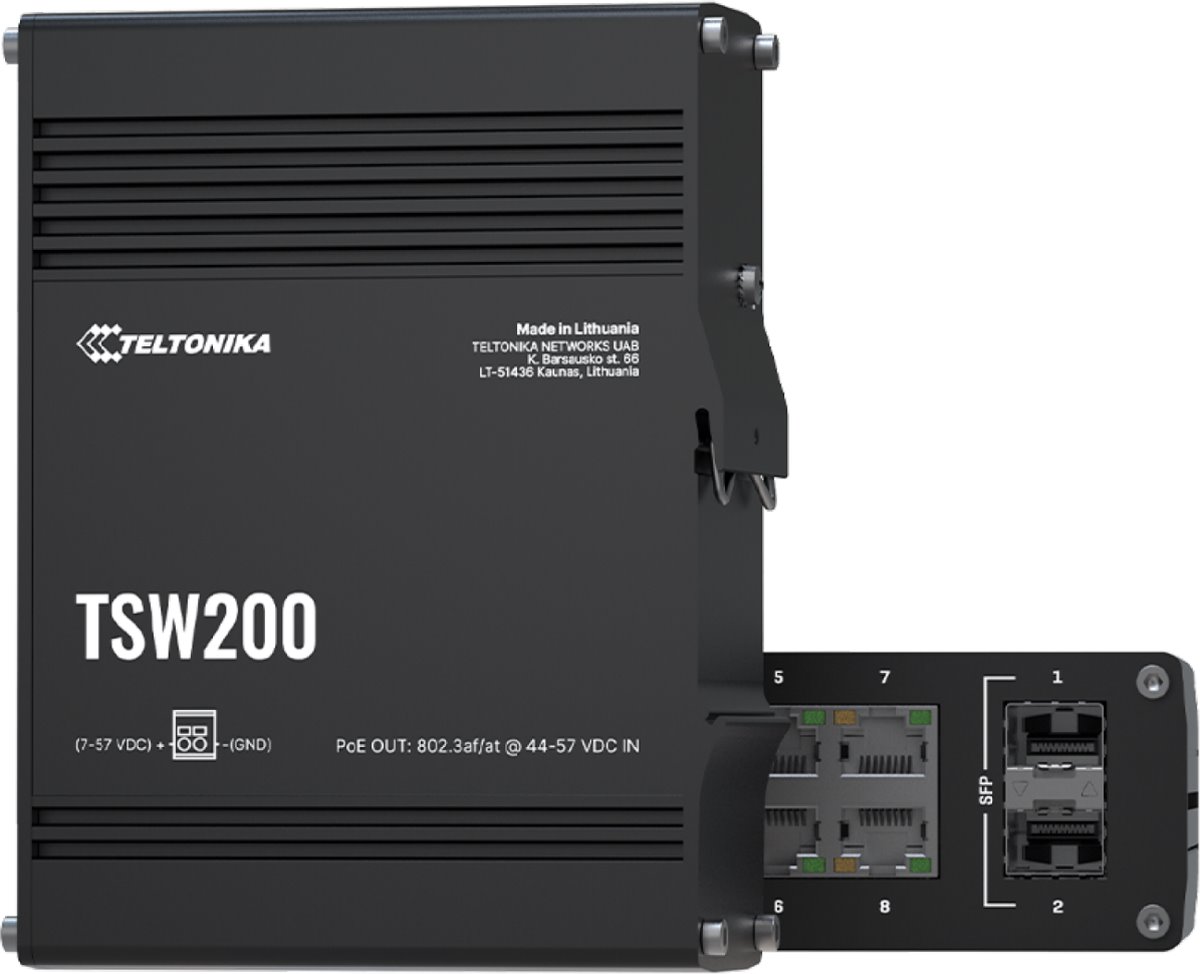 TSW200 is an industrial PoE switch from Teltonika Networks with an aluminum body, passive cooling, without management and the switch can also be installed on a DIN rail with integrated holder. The device offers 2 SFP ports with Gigabit speed, 8 LAN ports with 10/100/1000 Mbps speed, support 802.3af/at PoE (30 W/port) on all eight ports and a total PoE budget of 240 W . The power supply is handled by a 2-pin terminal block with input voltage 7 to 57 V.