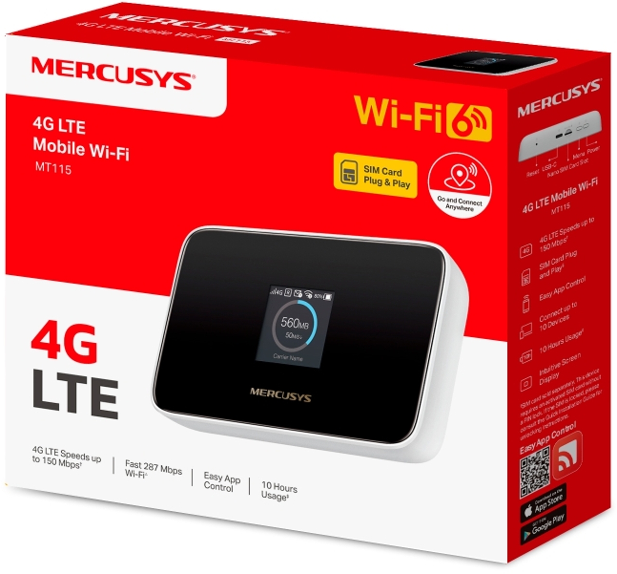 MERCUSYS MT115 is a 4G LTE router that, thanks to its compact size and built-in 2400 mAh battery, is ideal for use on the go. After inserting a SIM card, it creates a Wi-Fi 6 hotspot with download speeds of up to 150 Mbps and upload speeds of up to 50 Mbps, supporting up to 10 users simultaneously. On a single charge, it can operate for up to 10 hours, and the device can be easily managed via the MERCUSYS mobile app. In addition, it features an intuitive display that shows all key information at a glance, making it easy to track data usage and stay within your monthly data limit.