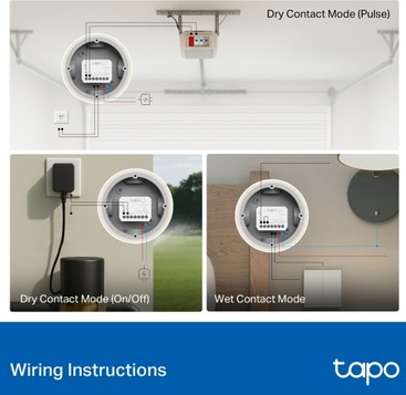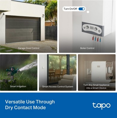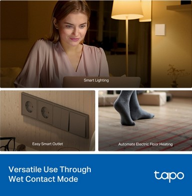 Tapo S110E supports dual modes, ideal for handling a wide range of applications. In dry contact mode, it is perfect for managing garage doors, boilers, irrigation and sprinkler systems, access control systems, and more. In wet contact mode, effortlessly control smart lights, outlets, and electric floor heating without replacing your existing equipment.