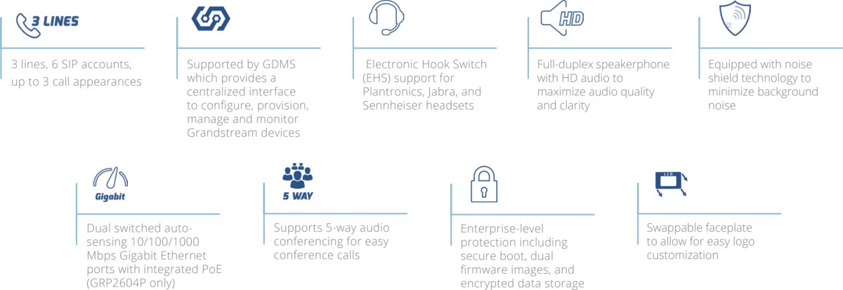 - Поддържа се от GDMS , който осигурява централизиран интерфейс за конфигуриране, осигуряване, управление и наблюдение на устройства Grandstream