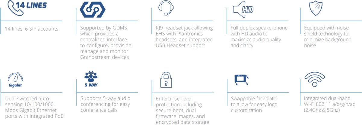 Това е автоматичен превод. Оригиналния текст може да видите тук14-линеен професионален IP телефон, проектиран за масово внедряване и лесно управление. GRP2670 разполага с 56 многофункционални бутона (MPK), интегрирани Wi-Fi и PoE , 5-инчов цветен LCD дисплей и други, и се поддържа от системата за управление на устройства (GDMS) на Grandstream.