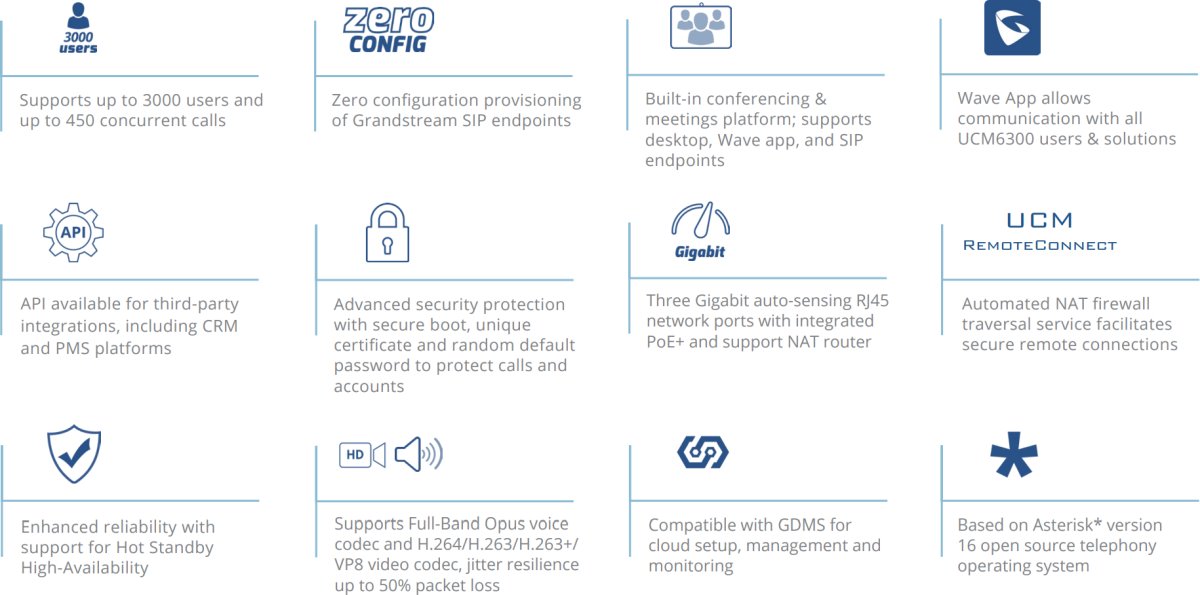 Серията UCM6300 позволява на бизнеса да изгражда мощни и мащабируеми решения за унифицирана комуникация и сътрудничество. Тази серия IP PBX предоставя платформа, която обединява цялата бизнес комуникация в една централизирана мрежа, включително гласови разговори, видеоконферентна връзка, видеонаблюдение, уеб срещи, данни, анализи, мобилност, достъп до съоръжения, домофони и други. Серията UCM6300 поддържа до 3000 потребители и включва вградено решение за уеб срещи и видеоконферентна връзка, което позволява на служителите да се свързват от настолни компютри, мобилни устройства, устройства от серията GVC и IP телефони. Тя може да се сдвои с екосистемата UCM6300, за да предложи хибридна платформа, която комбинира контрола на локална IP PBX с отдалечения достъп на облачно решение. Екосистемата UCM6300 се състои от приложението Wave за уеб и мобилни устройства , което предоставя хъб за отдалечена съвместна работа, и UCM RemoteConnect, услуга за преминаване през облачен NAT за осигуряване на сигурни отдалечени връзки. Серията UCM6300 предлага също така настройка и управление в облака чрез GDMS и API за интеграция с платформи на трети страни . Като предлага висококачествено решение за унифицирани комуникации и сътрудничество, съчетано с набор от инструменти за мобилност, сигурност, срещи и сътрудничество, серията UCM6300 предоставя мощна платформа за всяка организация.