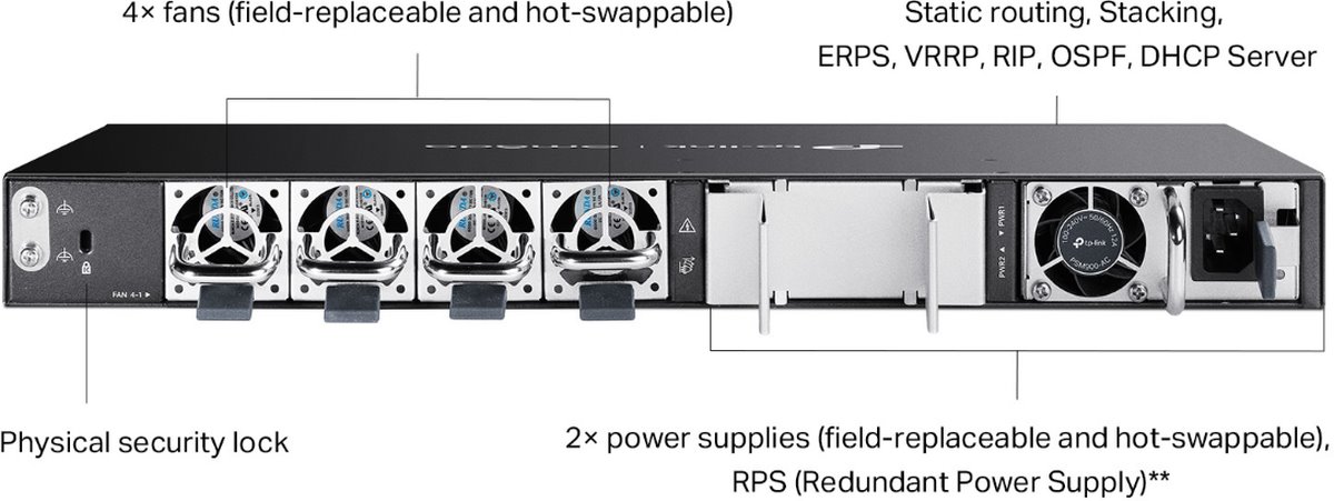 - Изключително наличен с две сменяеми на място захранвания , VRRP и ERPS