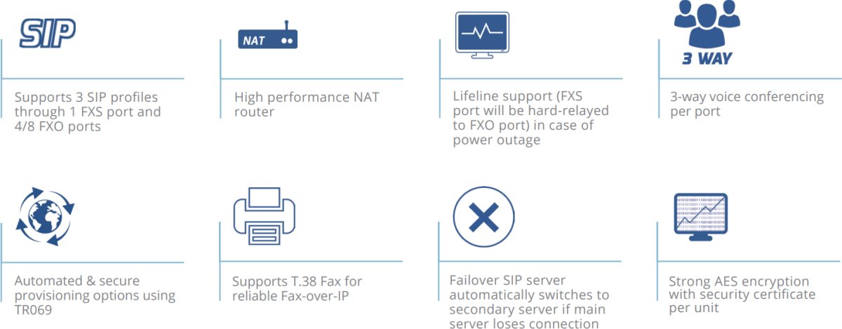 - Поддържа 3 SIP профила чрез 1 FXS порт и 4/8 FXO порта