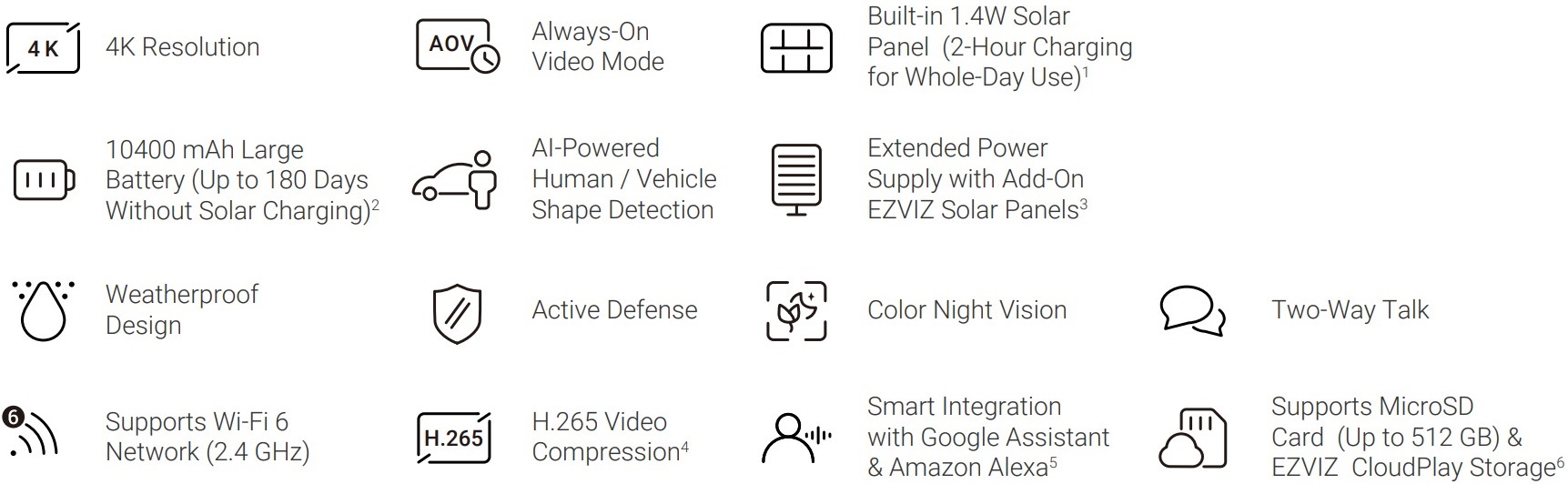 Това е автоматичен превод. Оригиналния текст може да видите тукEzviz EB5 4K е външна, безжична охранителна камера с интегрирана батерия от 10 400 mAh и соларен панел в едно. Позволява на потребителя да го постави навсякъде лесно, без кабели. Може да записва с висока разделителна способност 3840 x 2160 px и е оборудван с много модерни технологии.