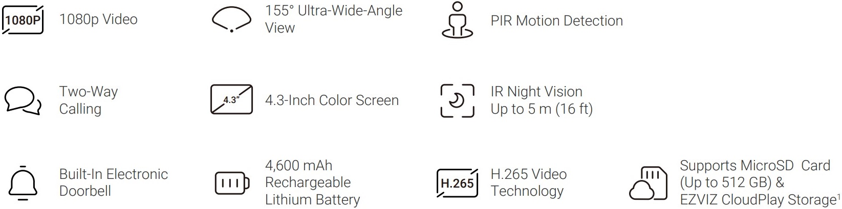 Камерата на звънеца покрива хоризонтално зрително поле от 136° . С инфрачервено осветление , звънецът осигурява ясно изображение дори на тъмно. Вградените микрофон и високоговорител позволяват двупосочна комуникация. PIR сензорът за откриване на движение осигурява откриването на хора и ги отличава от други обекти. Видеодомофонът е снабден с батерия с капацитет 4600mAh , елиминираща необходимостта от постоянна връзка към захранването. Екранът може да бъде настроен да се включва автоматично, когато бъдат открити хора в наблюдаваната зона.