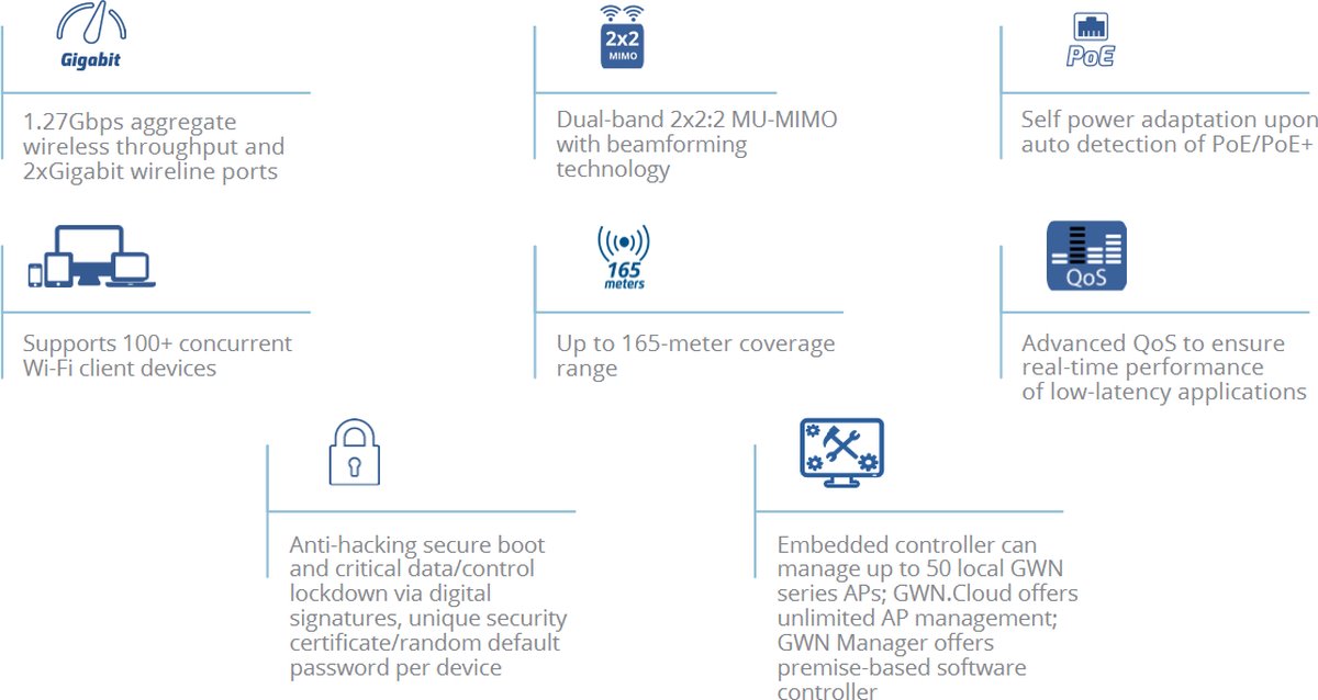 - Вграденият контролер може да управлява до 50 локални точки за достъп от серията GWN; GWN.Cloud предлага неограничено управление на точки за достъп; GWN Manager предлага софтуерен контролер, базиран на място