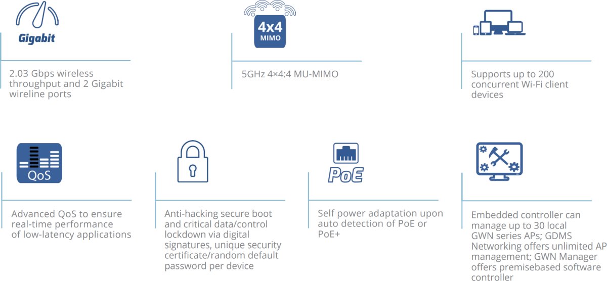 - Вграденият контролер може да управлява до 30 локални точки за достъп от серията GWN