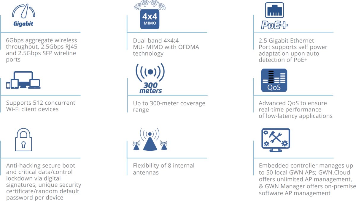 - Вграденият контролер управлява до 50 локални GWN точки за достъп; GDMS Networking предлага неограничено управление на точки за достъп, а GWN Manager предлага локално софтуерно управление на точки за достъп.