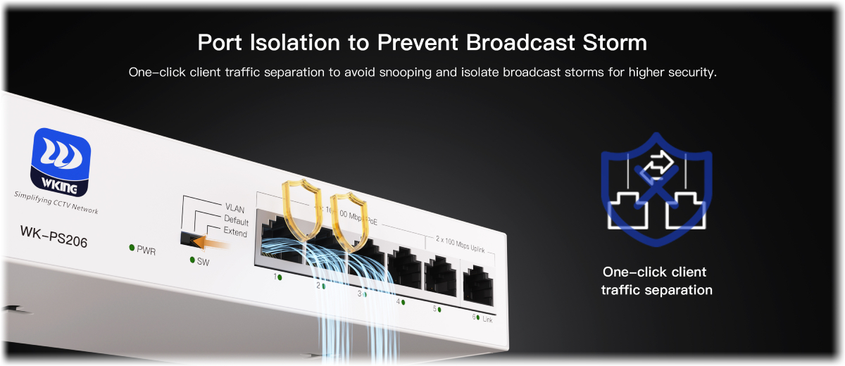 Това е автоматичен превод. Оригиналния текст може да видите тукWK-PS206 е компактен и рентабилен 100Mbps PoE комутатор, идеален за малки до средни системи за видеонаблюдение или IP мрежи. Той предлага 4 PoE порта, поддържащи IEEE 802.3af/at (до 30W на порт), и 2 uplink порта за свързване към опорната мрежа. С функции като VLAN, Extend режим и PoE watchdog, той предоставя интелигентно и надеждно мрежово решение. Това е перфектният избор за потребители, които търсят лесен и функционален начин за захранване и предаване на данни към системи за видеонаблюдение, IP телефони или Wi-Fi точки за достъп, без да са необходими допълнителни сплитери или конфигурация.