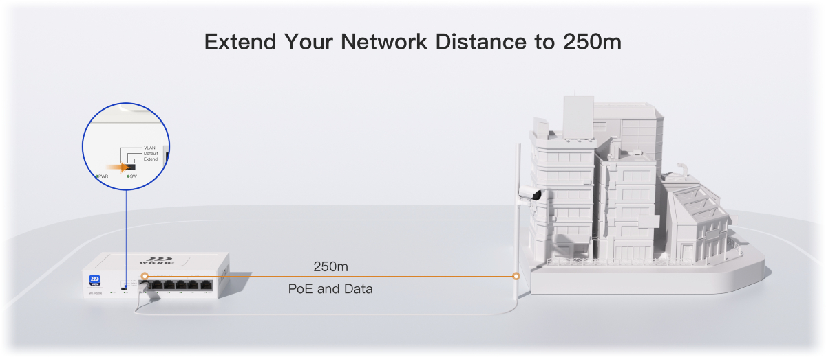В режим Extended, комутаторът може да предава мощност и данни до 250 метра (с намалена скорост от 10 Mbps). Идеален за разполагане на камери в големи зони, където стандартното PoE ограничение от 100 м би било недостатъчно.