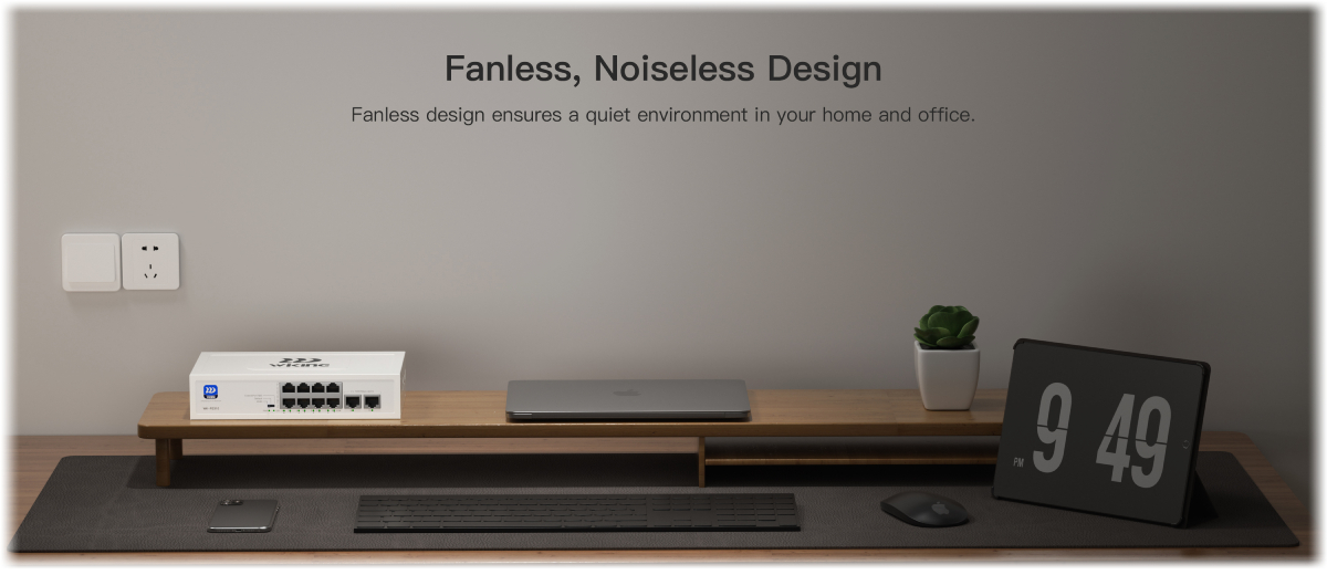 Благодарение на пасивното безвентилаторно охлаждане, комутаторът работи безшумно. Подходящ е не само за монтаж в шкаф, но и за поставяне директно на бюро в офис, рецепция или малък бизнес.