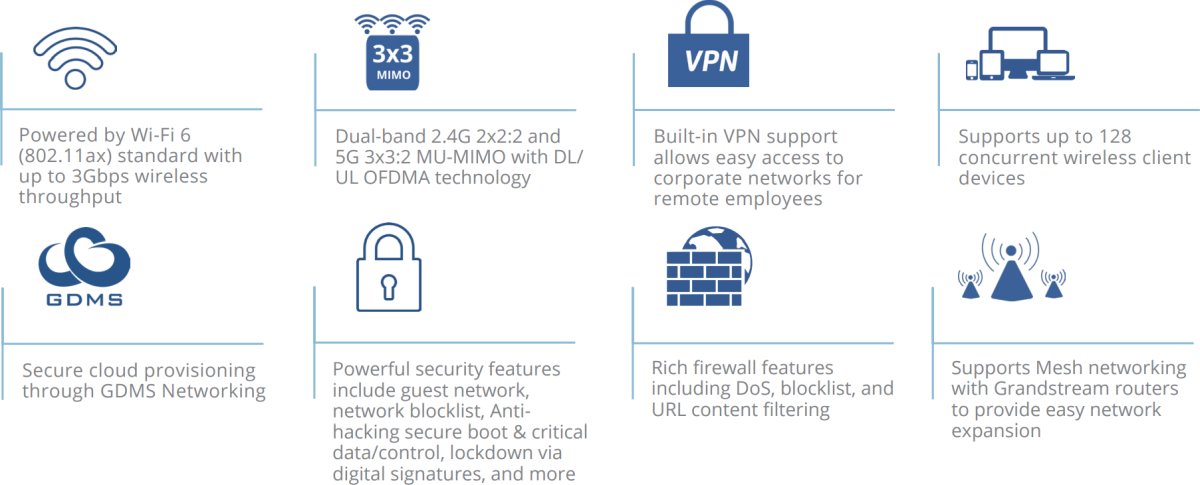 - Поддържа Mesh мрежи с Wi-Fi точки и рутери Grandstream, за да осигури лесно разширяване на мрежата