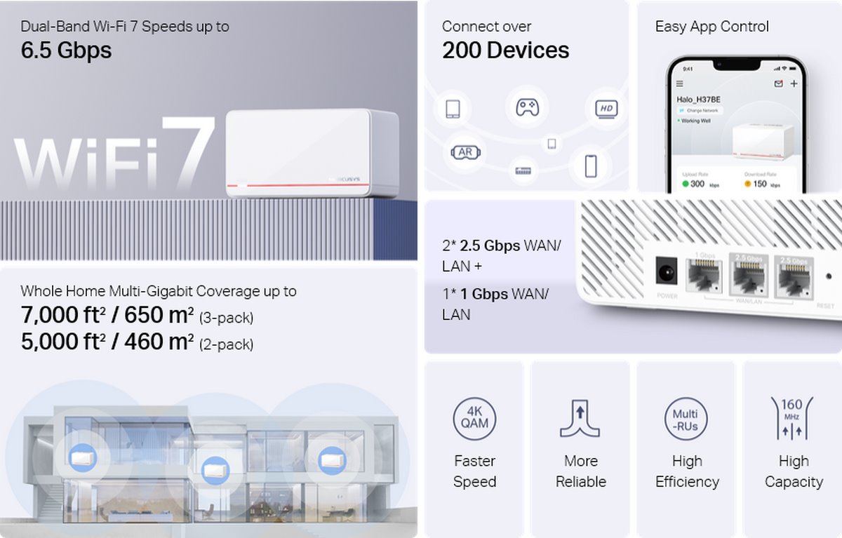 - Най-новият Wi-Fi 7: Въоръжена със 160 MHz канали, 4K-QAM, MLO и други функции, предлагани от Wi-Fi 7, вашата мрежа ще ви осигури зашеметяваща производителност.