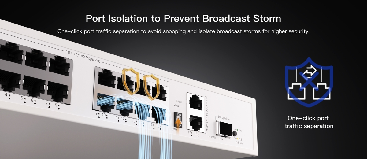 - VLAN - позволява изолиране на портове, при което всеки PoE порт може да предава данни само към uplink портовете, и функцията PD Alive, която автоматично рестартира изключени или неотзивчиви PoE устройства