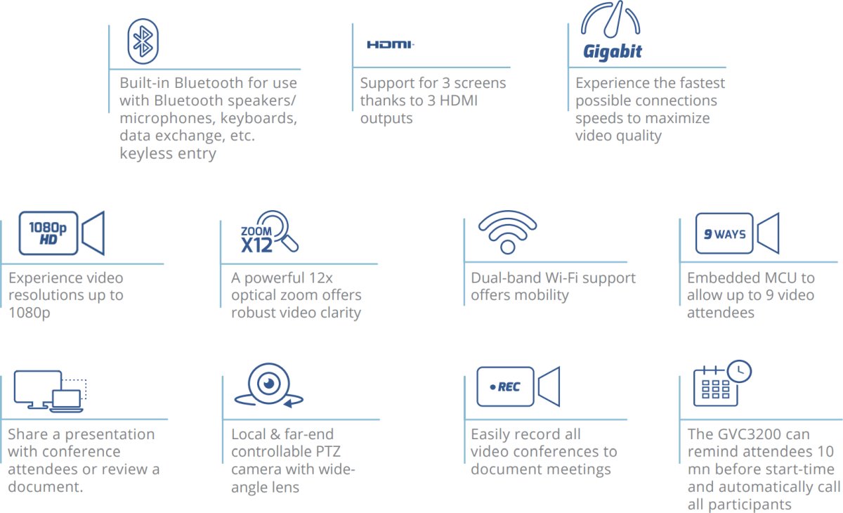 The GVC3200 is a revolutionary video conferencing system that provides an interactive and immersive video conferencing environment to increase collaboration and productivity. This SIP-based GVC3200 allows the user to connect their video conferencing solutions with any 3rd party SIP or H.323 video conferencing platform. Users will elevate their experience with its 1080p Full-HD video, up to 9-way video conferences, 3 monitor outputs, screen-sharing capabilities, Wi-Fi and more. The GVC series supports Grandstream's IPVideoTalk Video and Web Conferencing platform. This paid-subscription based service allows users to turn any meeting hosted on any GVC device into an online meeting that can be joined seamlessly from a web browser or GVC. Turn any physical room into a virtual, online meeting place to offer your customers the tools they need to be successful, no matter where they are.