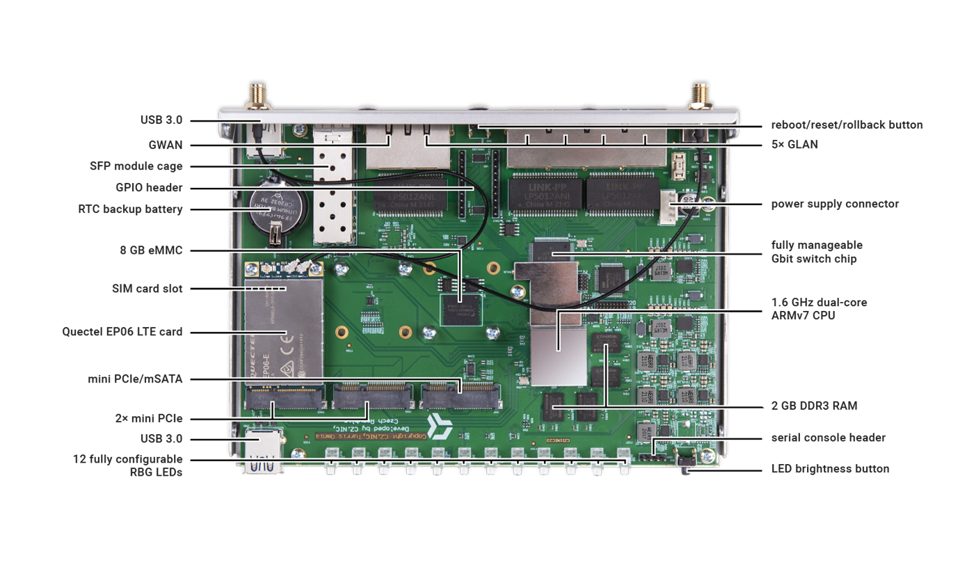 The Omnia device can run a custom Linux distribution via eMMC, avoiding RAM load. Omnia can also be expanded with Wi-Fi thanks to 2x mini PCIe slots, one of which can also function as mSATA. There are also 2x USB 3.0 ports available, offering the possibility of additional storage limited only by the capacity of the USB drive.
