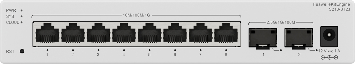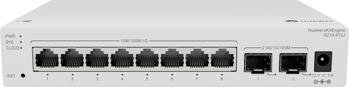 Huawei S210-8T2J is a reliable managed cloud L2 switch with a switching capacity of 26Gbps, (8) Gbit ports and (2) 2.5G SFP slots. It supports management via a local web interface as well as cloud management (eKit SNC / eKit mobile app). The maximum power consumption is 10.9W.