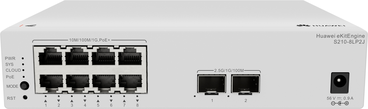 Huawei S210-8LP2J is a reliable managed cloud L2 PoE switch with a switching capacity of 26Gbps, (8) Gbit PoE+ ports and (2) 2.5G SFP slots. The RJ45 ports support PoE+ with a 32W budget. It supports management via a local web interface as well as cloud management (eKit SNC / eKit mobile app). The maximum power consumption is 15.6W (without PoE load).