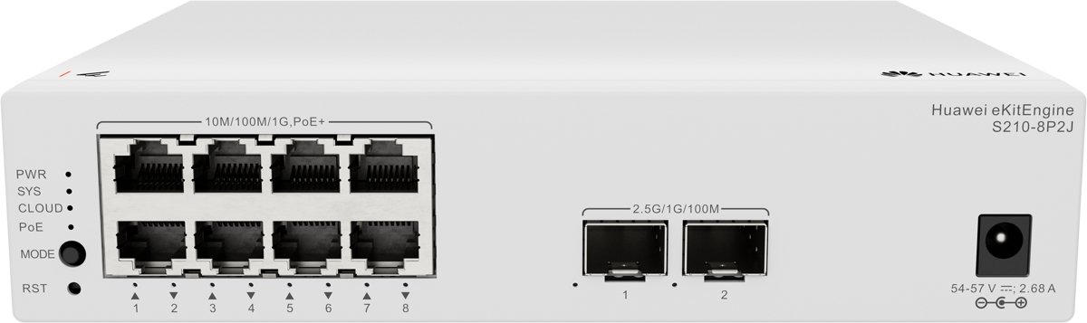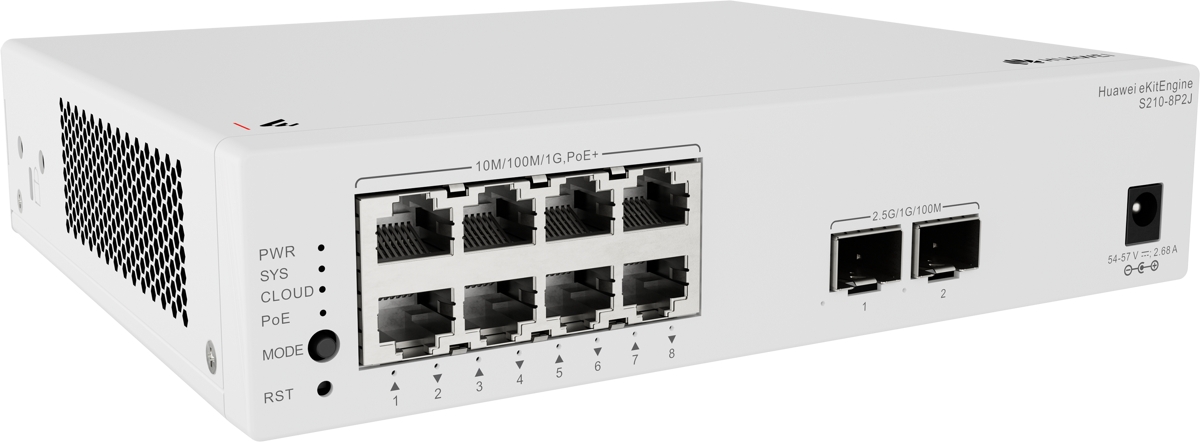 Huawei S210-8P2J is a reliable managed cloud L2 PoE switch with a switching capacity of 26Gbps, (8) Gbit PoE+ ports and (2) 2.5G SFP slots. The RJ45 ports support PoE+ with a 128W budget. It supports management via a local web interface as well as cloud management (eKit SNC / eKit mobile app). The maximum power consumption is 17.6W (without PoE load).