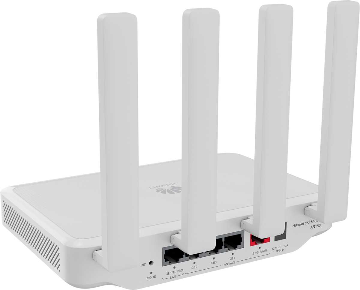 Huawei AR180 is a high-performance dual-band Wi-Fi 7 router, operating simultaneously on two bands (2.4GHz and 5GHz) to achieve a maximum data transfer rate of up to 3.57Gbps. The router is equipped with (1) 2.5G port, (4) Gbit ports and supports management via a local web interface as well as cloud management (eKit SNC / eKit mobile app). It features modern technologies such as MU-MIMO, 4096-QAM and MLO. The device's maximum power consumption is 13W.