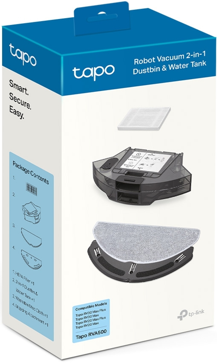 The TP-Link Tapo RVA500 is a replacement 2-in-1 dustbin and water tank for Tapo robot vacuums. Easy to install. No tools required.