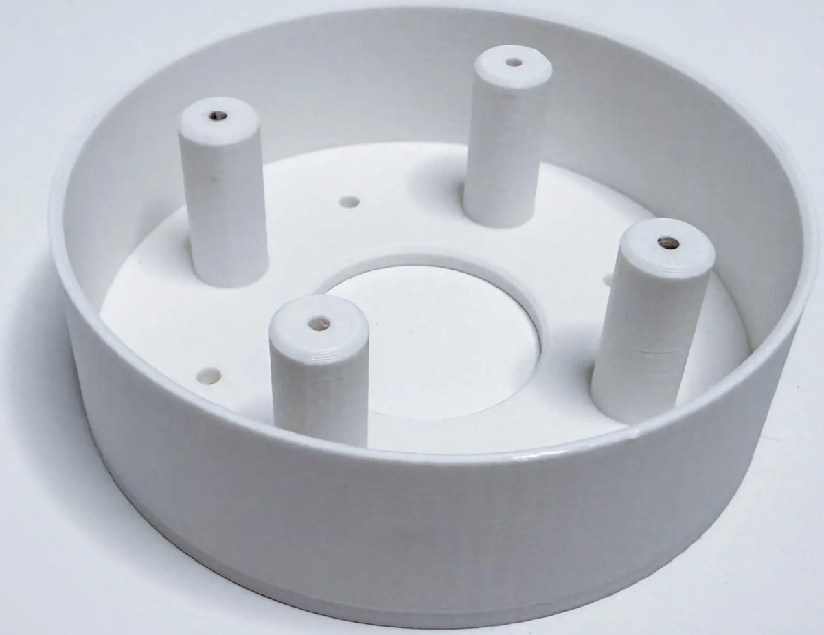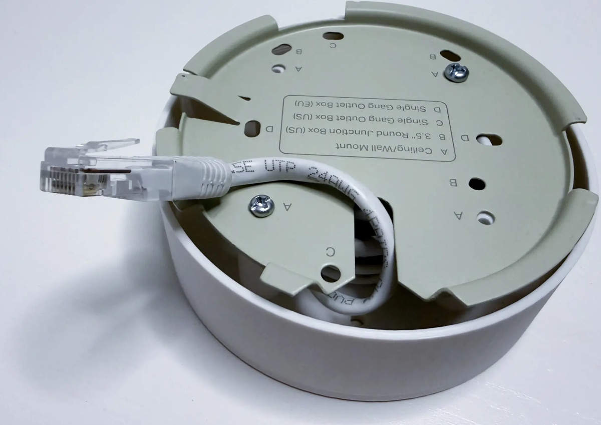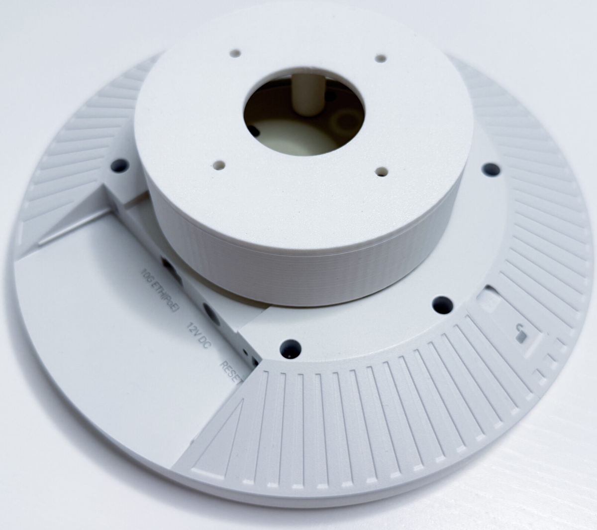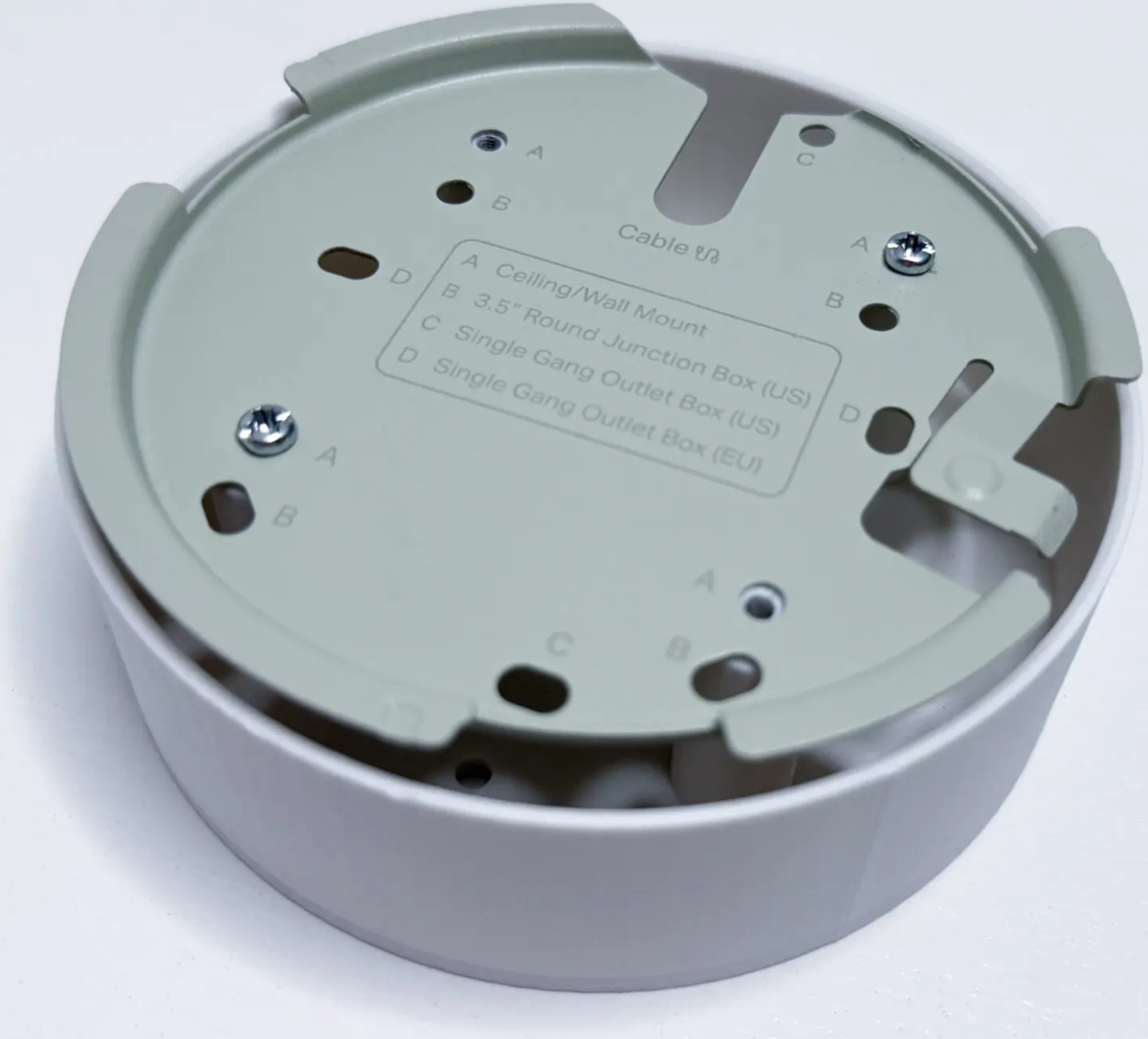 White wall/ceiling mount with a cable cover, 3D printed from PETG.