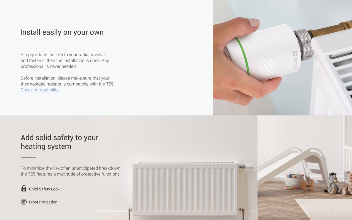 Ezviz T55 is a smart Zigbee thermostatic radiator valve that enables intelligent heating control (requires connection via the A3 home gateway). It supports automation and remote control through the EZVIZ app. It offers a child safety lock, frost protection and compatibility with Google Assistant and Amazon Alexa for voice control.