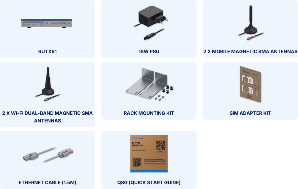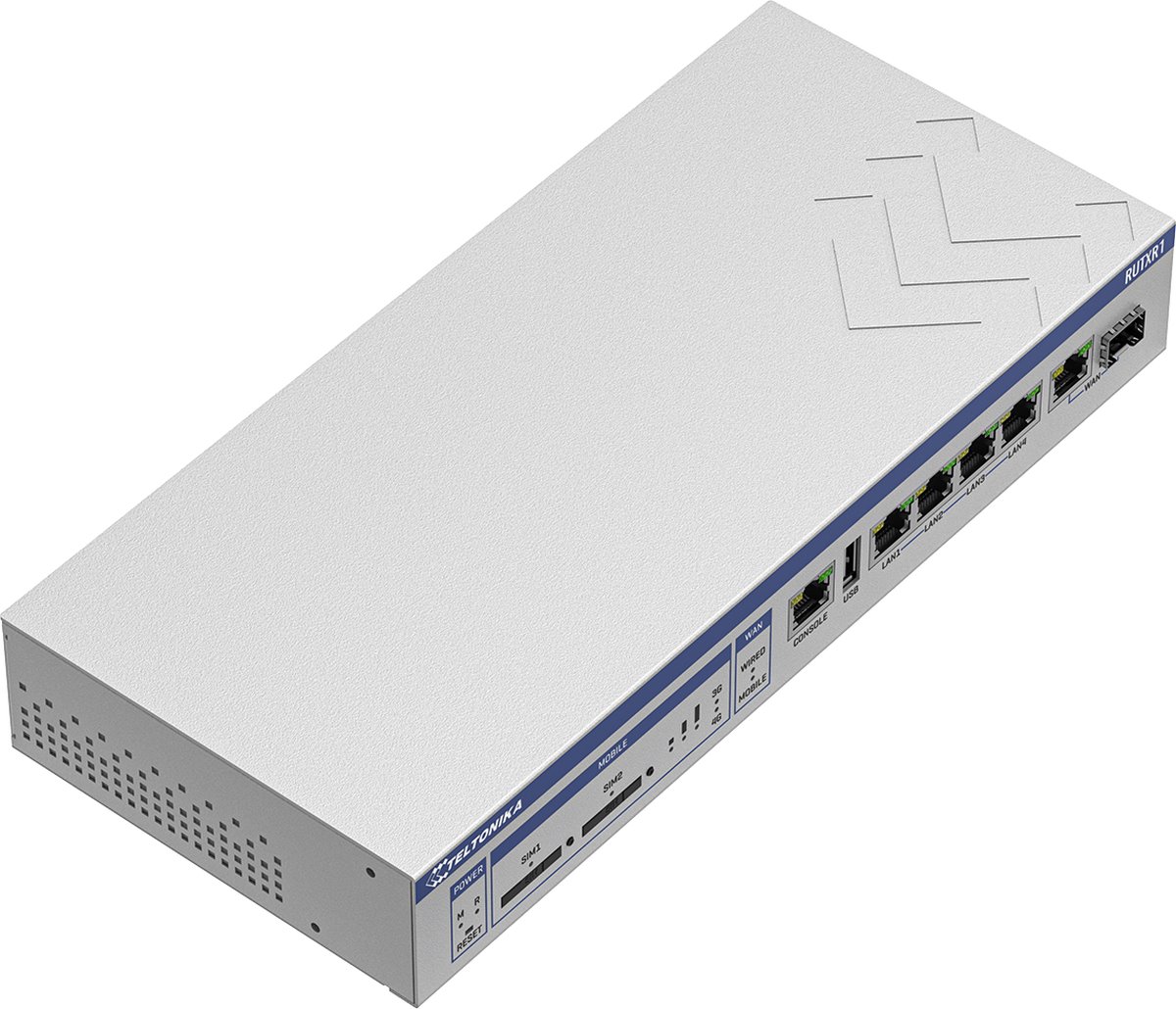 RUTXR1 is a rack-mountable LTE Advanced (LTE-A) router equipped with 5x Gigabit Ethernet ports, WiFi, Dual-SIM, USB port, Console port, redundant power supplies, SFP port and RutOS software for advanced networking solutions.