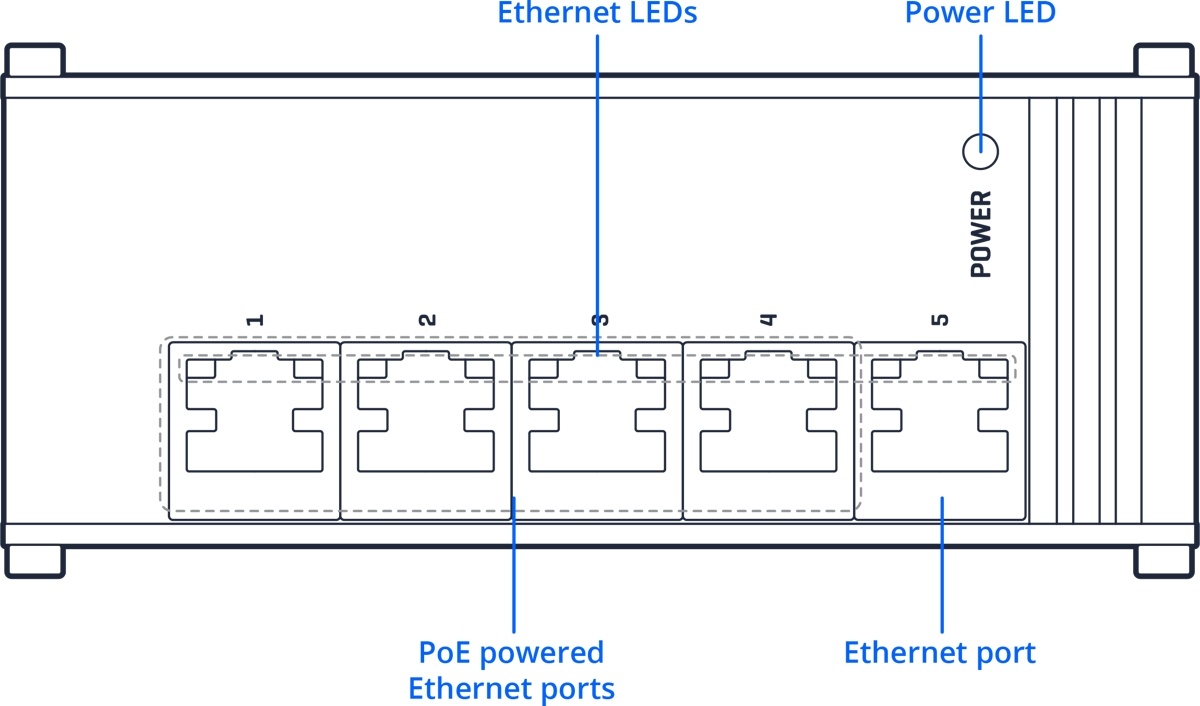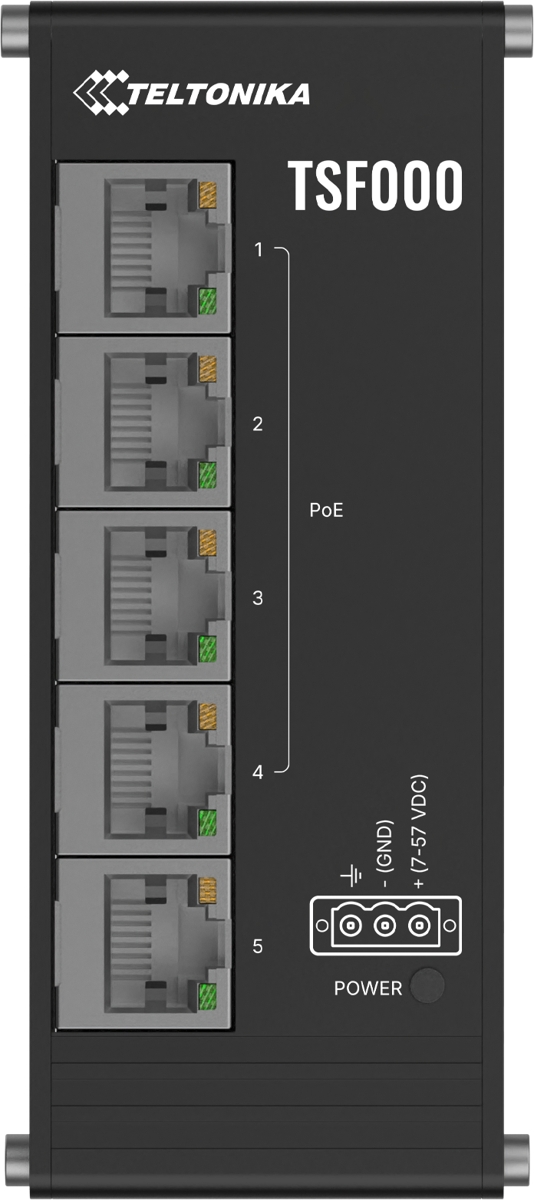 The Teltonika TSF000 is a low-profile unmanaged PoE switch with a switching capacity of 10Gbps and (5) 10/100Mbps ports (4x PoE-Out) designed for DIN rail mounting. Ports 1-4 support 802.3af/at PoE+ delivering up to 30W/port with a total budget of 120W. The switch is powered via a 7-57V DC terminal block and its power consumption is 1.5W (without PoE load).