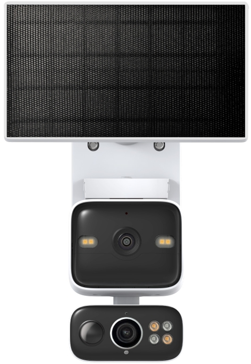 The TP-Link solar-powered IP PT dual Wi-Fi camera Tapo C645D KIT features (2) 3MP sensors (2304 x 1296 px), IP65 weather protection, combined IR/white light illumination for night vision up to 10m + flasher (strobe light and audible alarm) and two-way audio. The Bullet sensor has a fixed 2.53mm (137.6°) lens and the PTZ sensor has a fixed 6mm (56.5°) lens. The camera can be connected to the network via Wi-Fi 4.