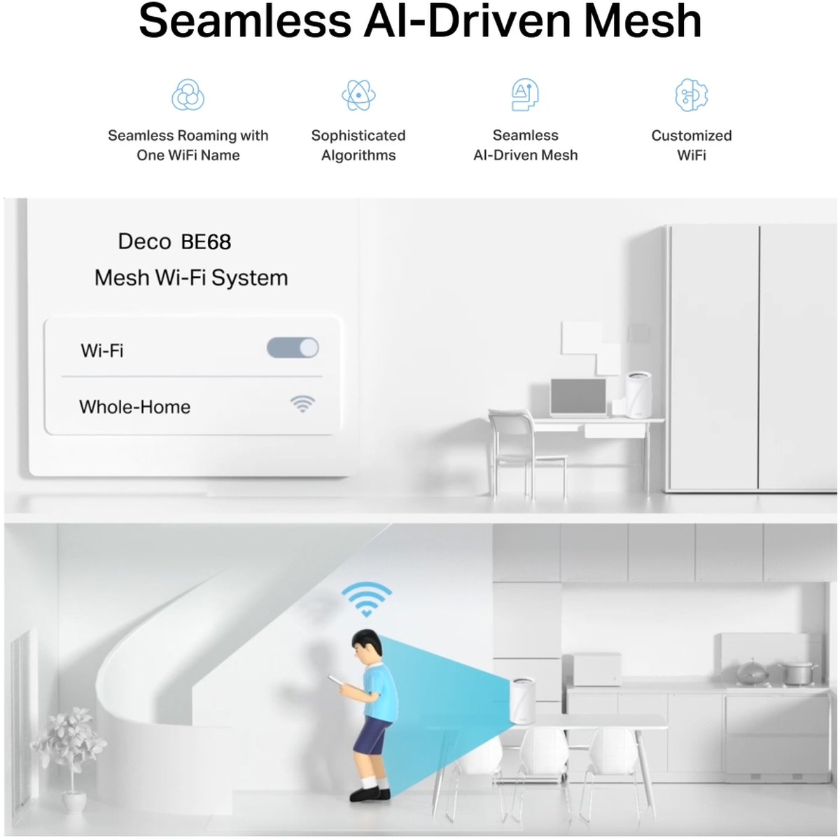 TP-Link Deco BE68 (3-pack) is the easiest way to ensure a strong Wi-Fi signal in every corner of your home. Wireless connectivity and the option to connect all units either via cable or wirelessly provide even higher network speeds and truly seamless coverage. Want more coverage? Just add another Deco unit.