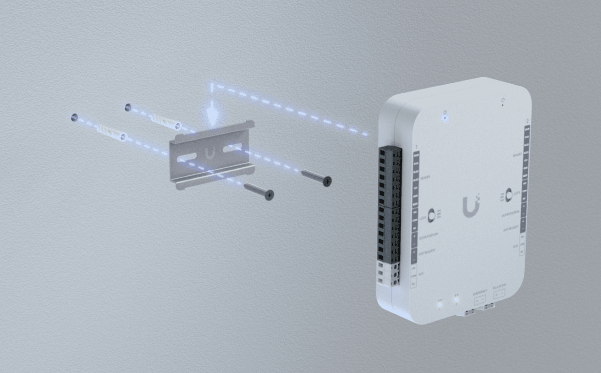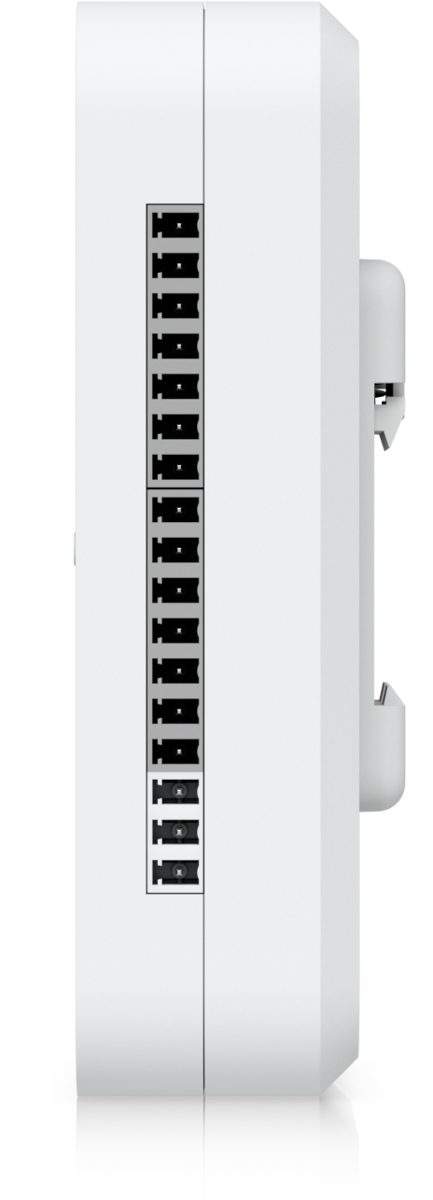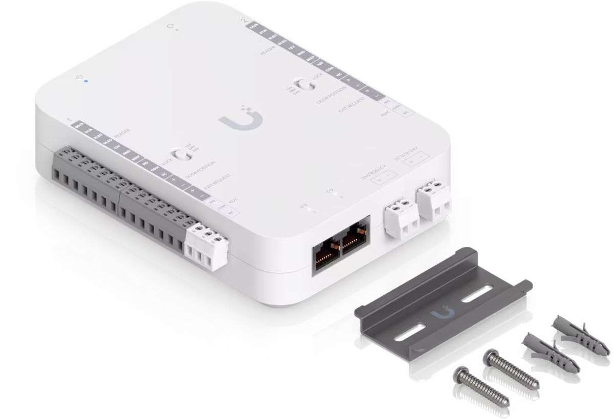 The Ubiquiti UniFi Access Retrofit Hub is designed to control up to 2 doors using existing cabling . It features (2) Wiegand/OSDP reader inputs, (2) relay outputs (configurable 12V/1A, 24V/0.5A, or dry), (2) 10/100Mbps ports, digital inputs for connecting (2) exit buttons and (2) door position sensors and (1) emergency input and output. Power is supplied via a 12-24V DC terminal block with the option to connect a backup battery using the UACC-Retrofit-PSU-12V.