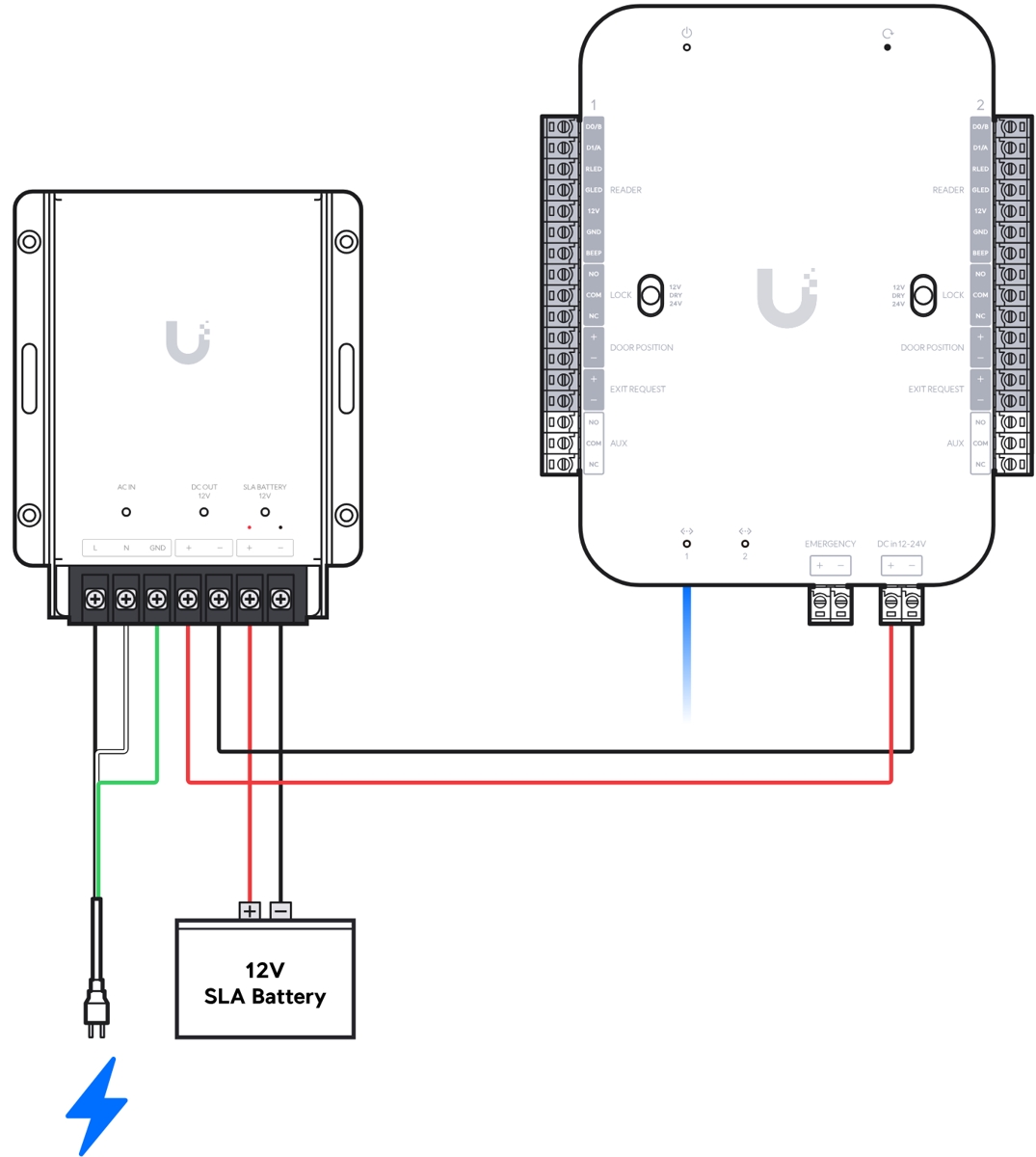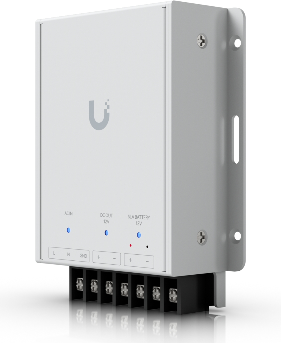 The Ubiquiti UACC-Retrofit-PSU-12V is a 12V DC power supply designed for use with the UA-Retrofit-Hub-2. It allows connection of a sealed lead-acid (SLA) battery, which serves as a backup power source during power outages, while also providing automatic battery charging.