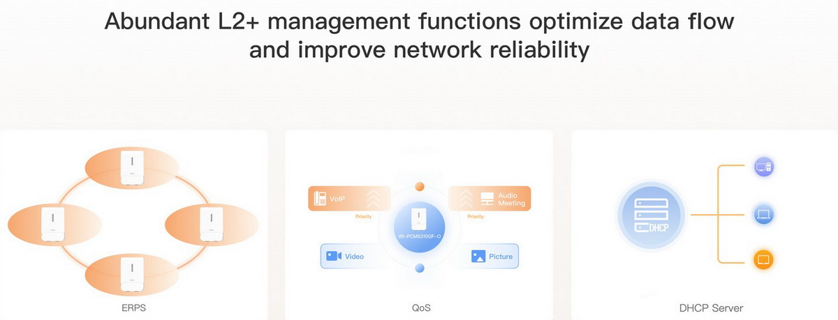 • Advanced Management: L2+ management, 802.11Q VLAN, LACP, STP/RSTP/MSTP, IGMP snooping, 802.11x, static routing, DHCP.