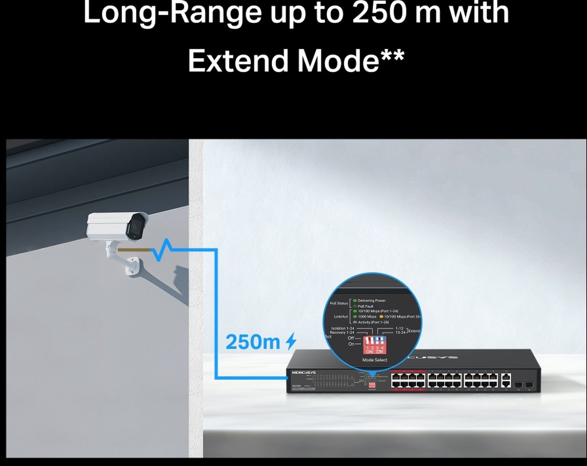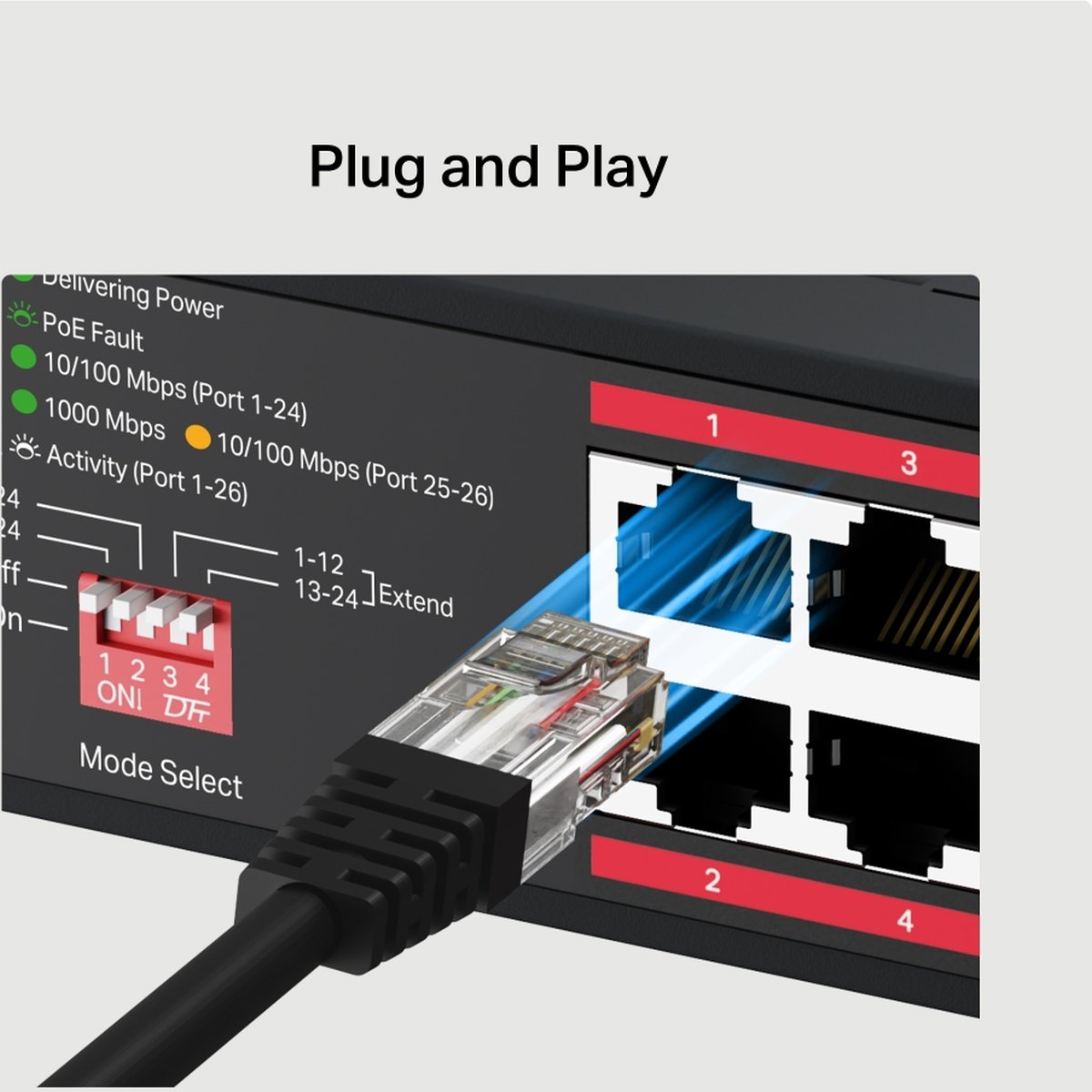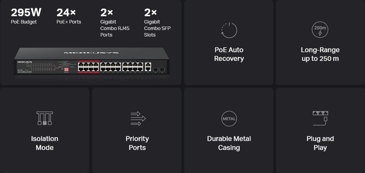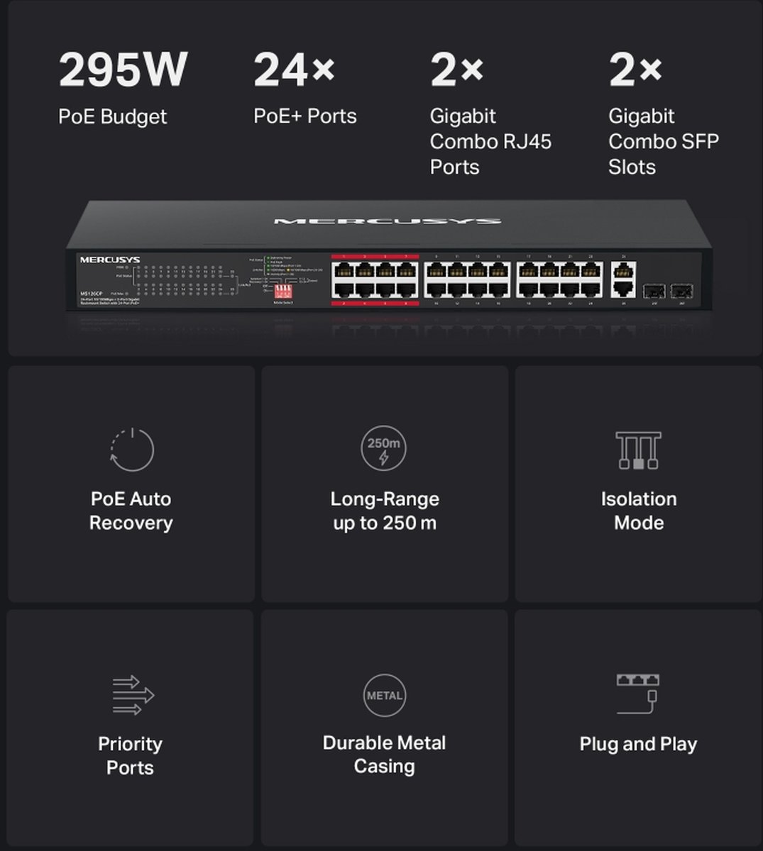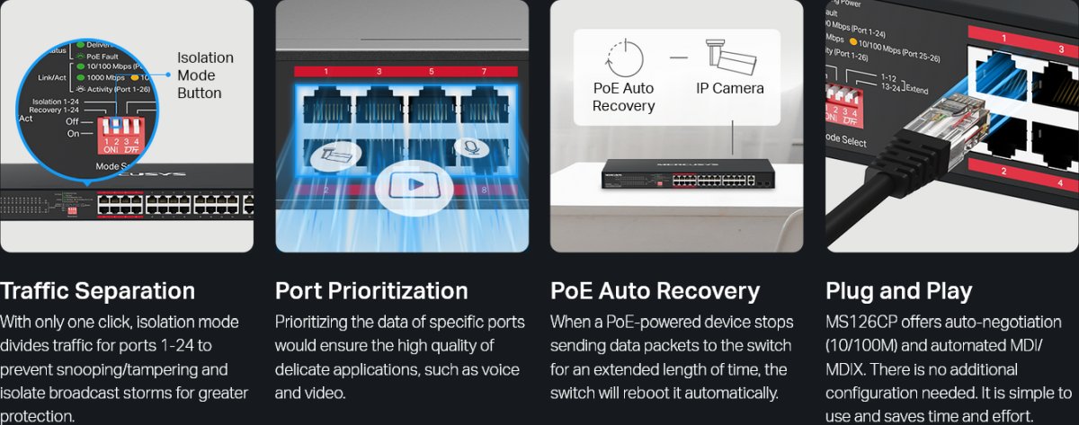 The MS126CP is a 26-port rackmount switch with 24x 10/100M PoE+ ports, ideal for small and medium business IP surveillance with a 295 W PoE budget. The plug-and-play design makes it easy for deployment without the need for a technician.