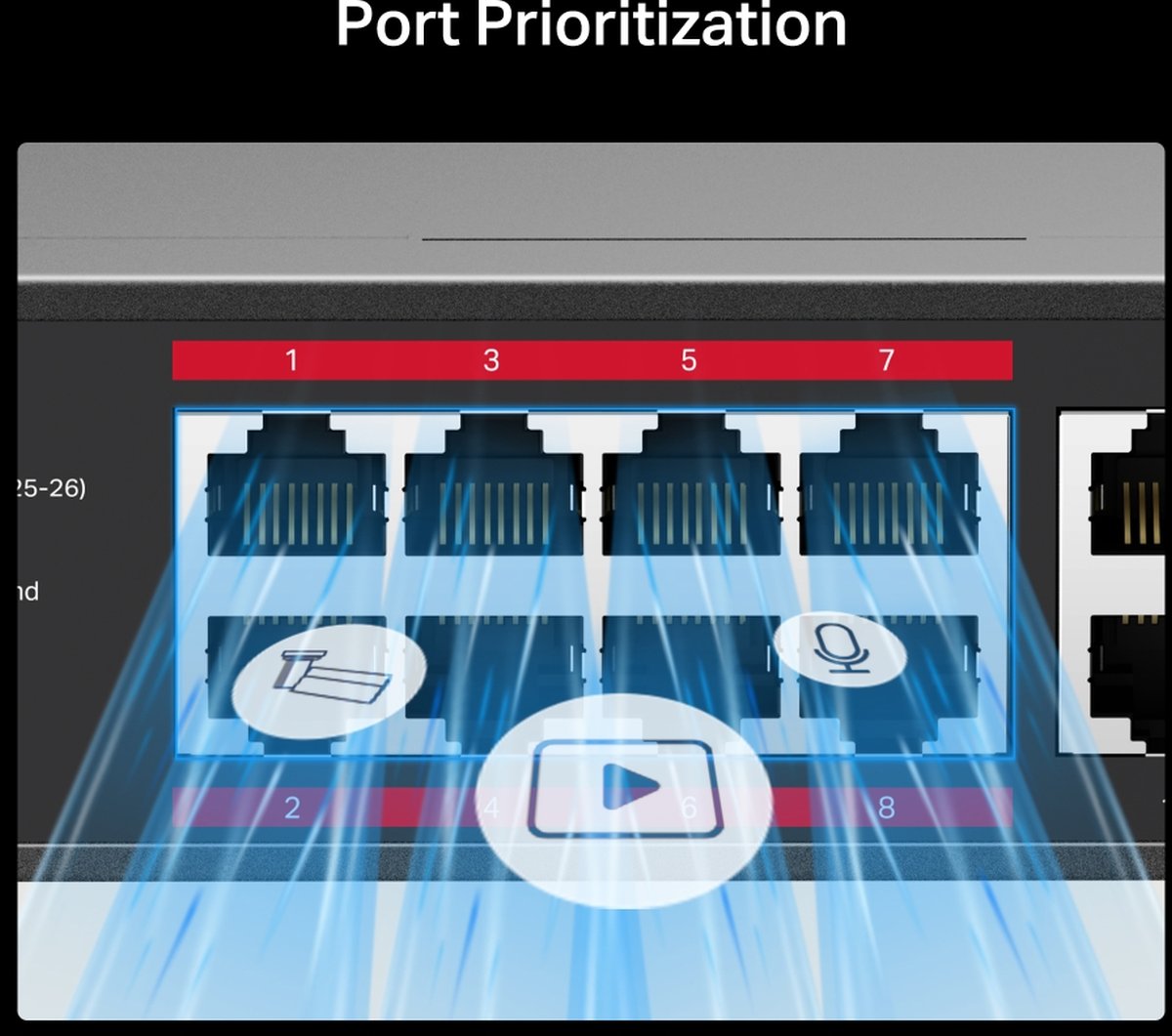 - Priority mode for ports 1–8 to guarantees the quality of sensitive applications like video monitor