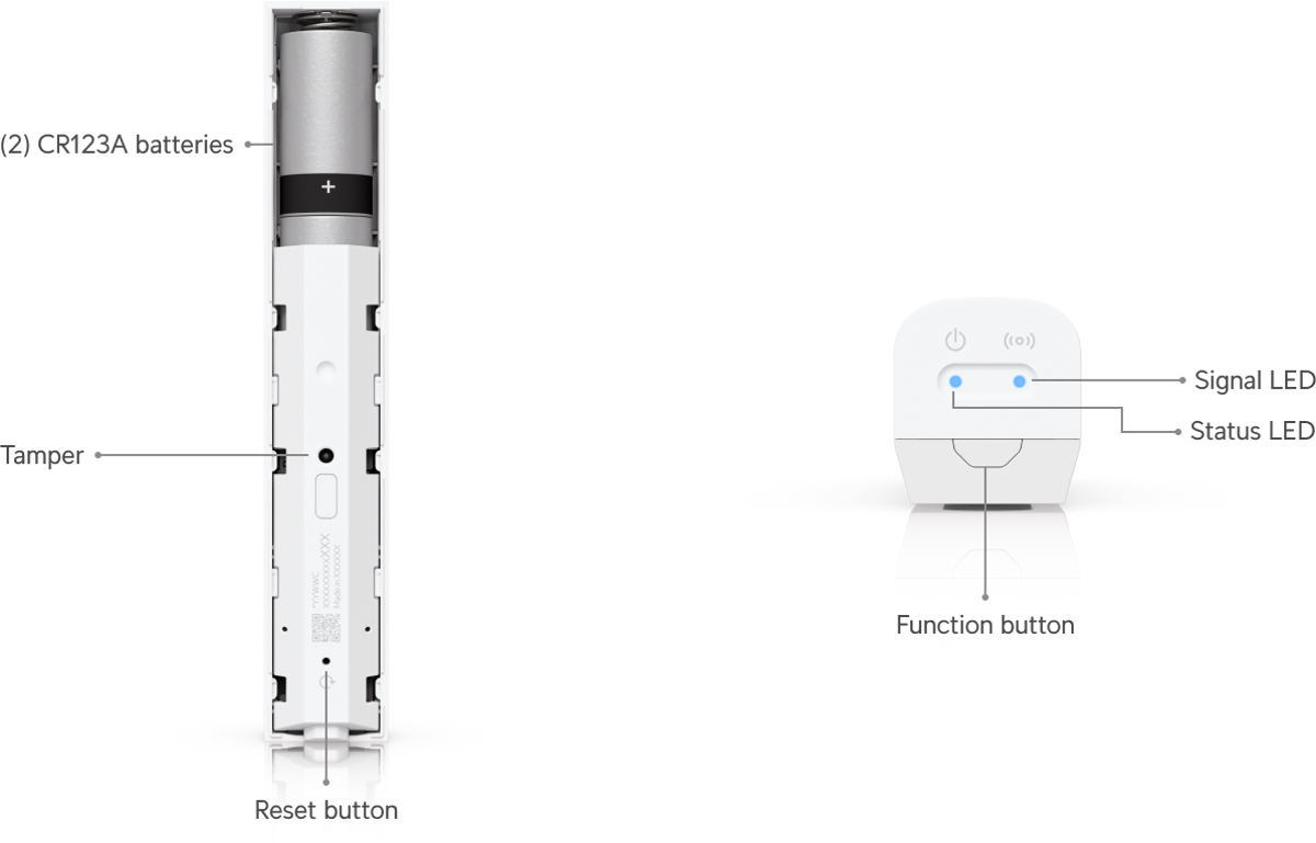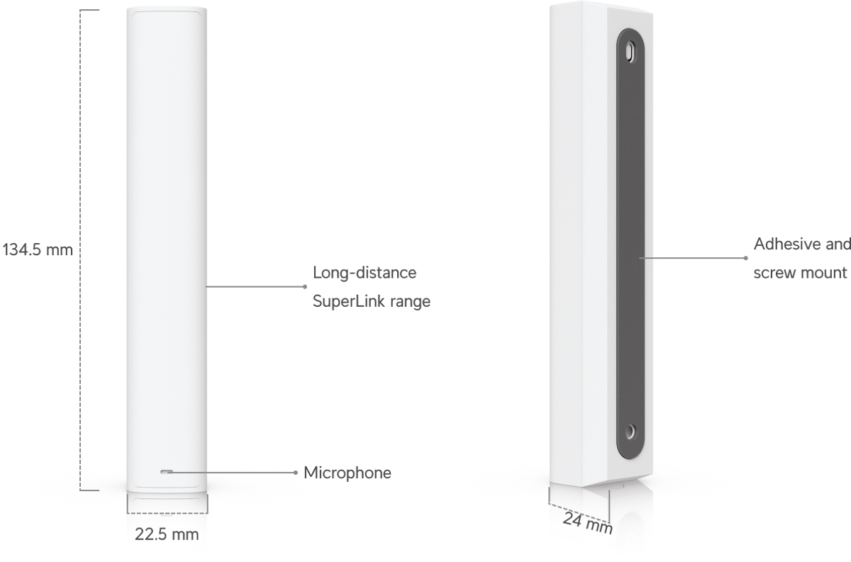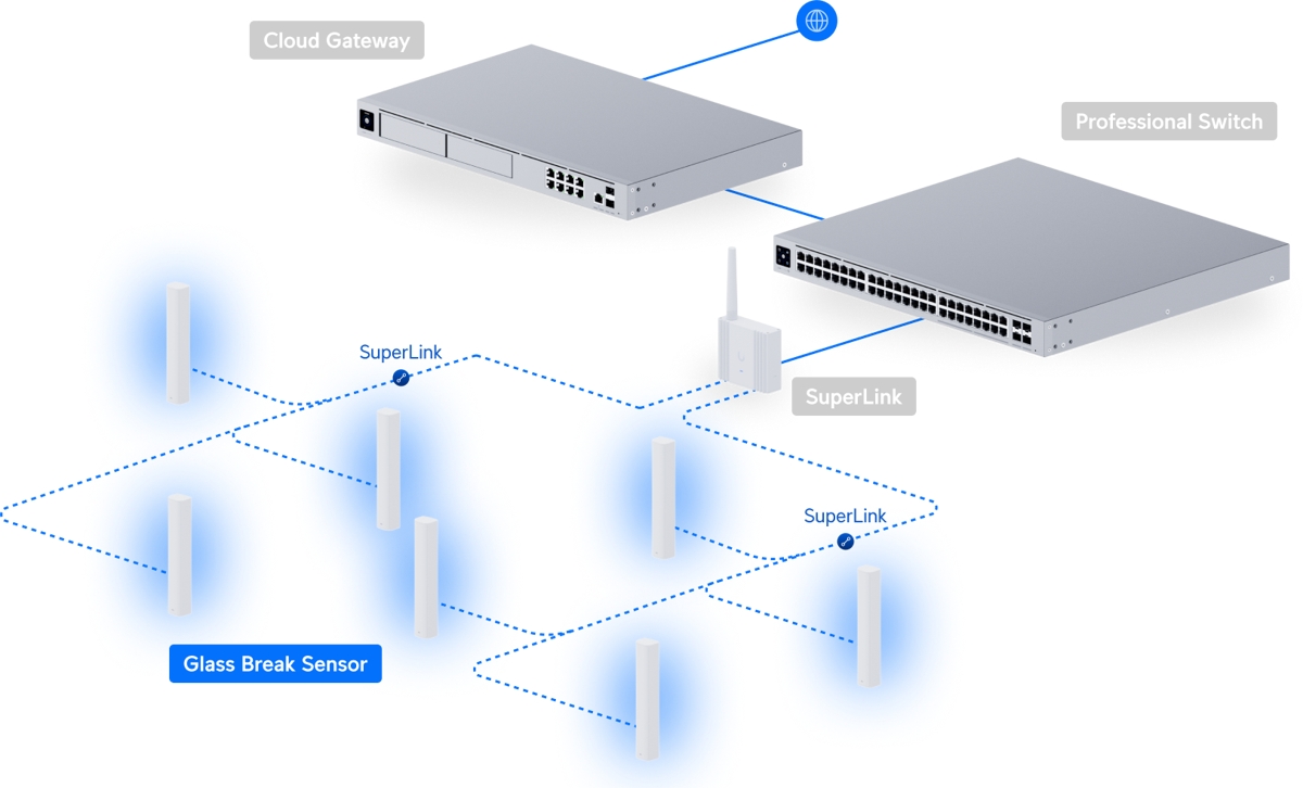The Ubiquiti USL-GlassBreak is a wireless UniFi Protect sensor designed to detect glass breakage and motion. It communicates with the gateway using the proprietary SuperLink protocol with range of up to 2km (in open space). The sensor can be easily attached using adhesive or screws to a wall and is powered by two CR123A batteries (included) with battery life of up to 3 years.