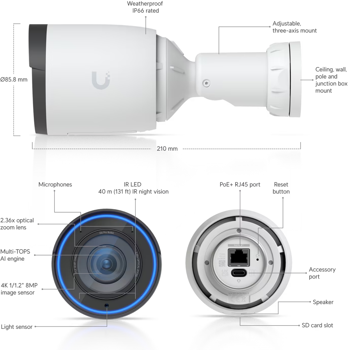 Това е автоматичен превод. Оригиналния текст може да видите тукUbiquiti G6 Pro Bullet разполага с 8MP сензор (3840 x 2160px) при 30 кадъра в секунда, варифокален обектив (2.36x оптично увеличение) и адаптивно IR осветление за нощно виждане до 40 метра. Камерата има здрав корпус, изработен от алуминий и поликарбонат, със защита IP66 срещу прах и мощни водни струи. Свързва се с мрежата чрез Gigabit LAN с поддръжка на PoE (37 до 57V DC) и максимална консумация на енергия от 15W.