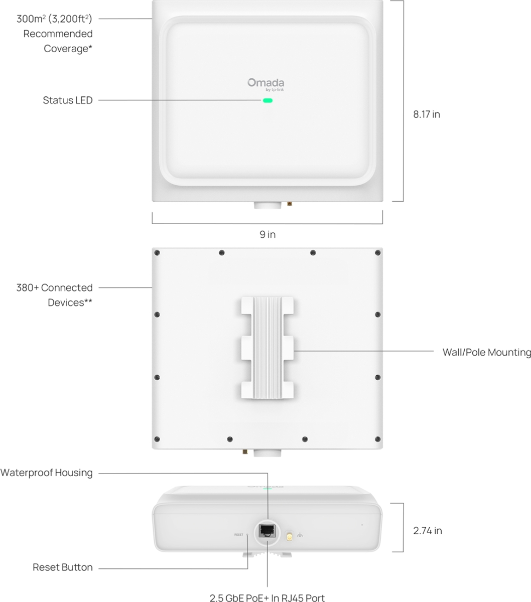Трибандовата Wi-Fi 7 точка за достъп TP-Link EAP772-Outdoor за корпоративни нужди е с издръжлив, напълно запечатан IP68 водоустойчив корпус, което я прави прахоустойчива и способна да издържи на потапяне във вода. Тя е устойчива на най-суровите външни условия. Осигурява връзка с общ капацитет до 9,2 Gbps . Общият капацитет се постига чрез едновременно излъчване в три честотни ленти със скорости до 5765 Mbps в 6 GHz честотната лента, 2882 Mbps в 5 GHz честотната лента и 688 Mbps в 2,4 GHz честотната лента с максимална ширина на канала до 320 MHz и най-новите технологии MLO, Multi-RU, MU-MIMO и OFDMA , които ви позволяват да комуникирате с множество устройства едновременно или да използвате множество безжични честоти за комуникация. Подобрена сигурност с WPA3 криптиране. Мрежовата връзка се осигурява от 1x 2.5G LAN порт с поддръжка на PoE 802.3at .