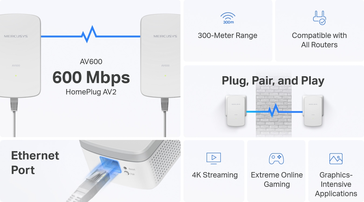Това е автоматичен превод. Оригиналния текст може да видите тукКомплектът Mercusys MP300 трансформира съществуващата ви електрическа мрежа във високоскоростна интернет мрежа, без да е необходимо допълнително кабеляване или пробиване. Не е необходима конфигурация, просто включете адаптерите в електрическите контакти, за да създадете мрежа мигновено. Скоростта на трансфер по електропровода е до 600 Mbps и осигурява 1x 10/100Mbps ethernet от двете страни за свързване към комутатор, рутер, компютър или друго устройство с RJ45 порт.