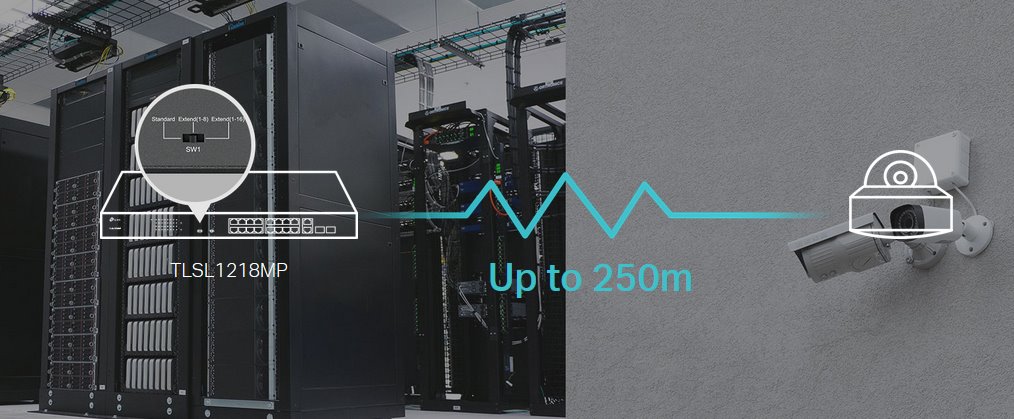 TL-SL1218MP е специално проектиран PoE комутатор за приложения за IP наблюдение. PoE превключвателят прави инсталацията за наблюдение по-проста, по-безопасна и по-евтина. С режима на разширение разстоянието на предаване на PoE достига до 250 m*, което го прави идеален за внедряване на IP камера в голяма област на покритие. *Скоростта на портовете, които са в режим на разширение, ще бъде намалена до 10Mbps. Действителното разстояние на предаване може да варира от качеството на кабелите.
